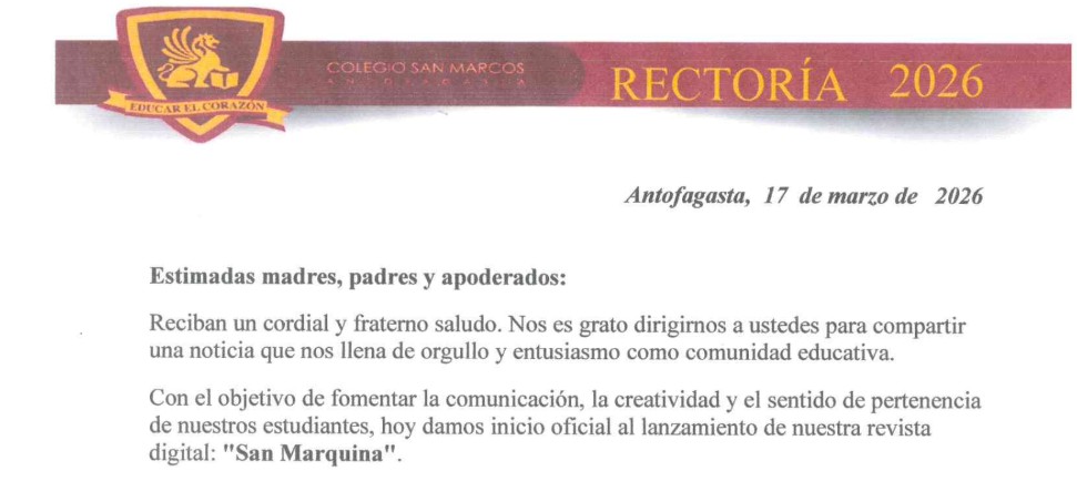 Colegio San Marcos es una comunidad educativa que se enraíza y fortalece a un naciente sector de Antofagasta, y que busca retomar la vida en comunidad y la formación afectiva e integral. Actualmente nuestro colegio atiende estudiantes desde Educación Pre-Escolar hasta Enseñanza Media.
